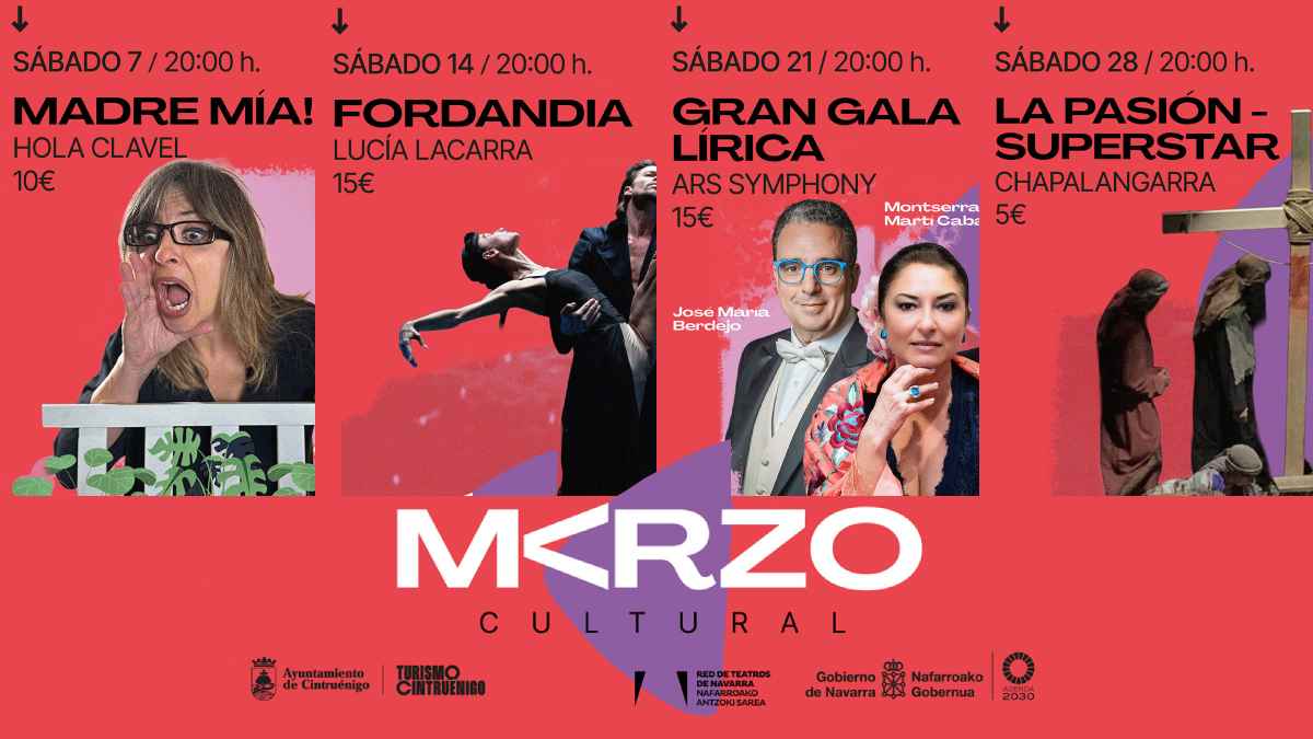 'Marzo Cultural' llega a Cintruénigo cargado de emociones y grandes espectáculos. La programación, impulsada por el Ayuntamiento en colaboración con la Red de Teatros de Navarra y el Gobierno de Navarra, apuesta por una oferta variada que combina humor, danza contemporánea, música lírica y teatro musical, pensada para públicos de todas las edades.