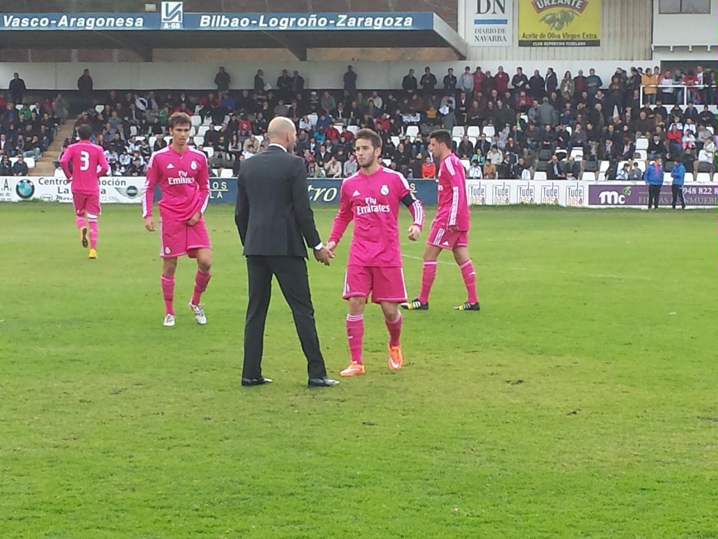 Primera parte donde el Real Madríd Castilla ha dominado un poco mas la pelota y el CD Tudelano buscando las contras y los balones en centros hacía el corazón del área madrileña ha llevado peligro. Así en el minuto 20 un balón cabezado por Jonathan es repelido por la defensa. Los madrileños salen muy rápidos al contragolpe un balón en largo sobre Burgui es centrado hacia el interior del área y de Tomás deja pasar hábilmente la pelota para que Alvaro que entra en segunda línea libre de marca marque a placer. Pero el Tudelano a pesar de recibir el gol no se viene abajo y un centro desde la izquierda el cabezazo de Goñi lo saca inextremis el guardameta visitante con el pie. El Tudelano ha dado un paso hacia delante y está empezando a crear algo mas de peligro, Goñi es derribado en el área y el penalti es transformado por Jonathan a 9 minutos del descanso. Aun lo intentó el equipo visitante y marcó un gol en el 44 De Tomás que fue anulado por fuera de juego.