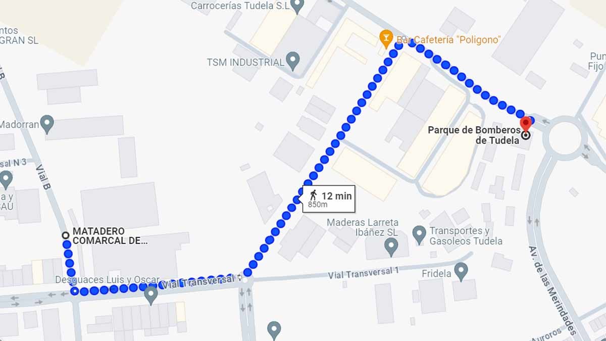 No sabemos exactamente cuál fue el atajo que tomó el ternero en su huida para llegar prácticamente hasta el parque de bomberos, pero si nos fijamos en Google Maps la ruta más directa a pie es de 12 minutos y 850 metros.