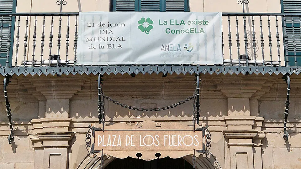 Este miércoles 21 de junio se celebra el Día Internacional de los pacientes con Esclerosis Lateral Amiotrófica (ELA) y el Ayuntamiento de Tudela, en muestra de apoyo a la asociación ANELA, ha colocado, desde hoy hasta el próximo 22 de junio, una lona en el balcón de la Casa del Reloj, edificio que se iluminará en color verde mañana.