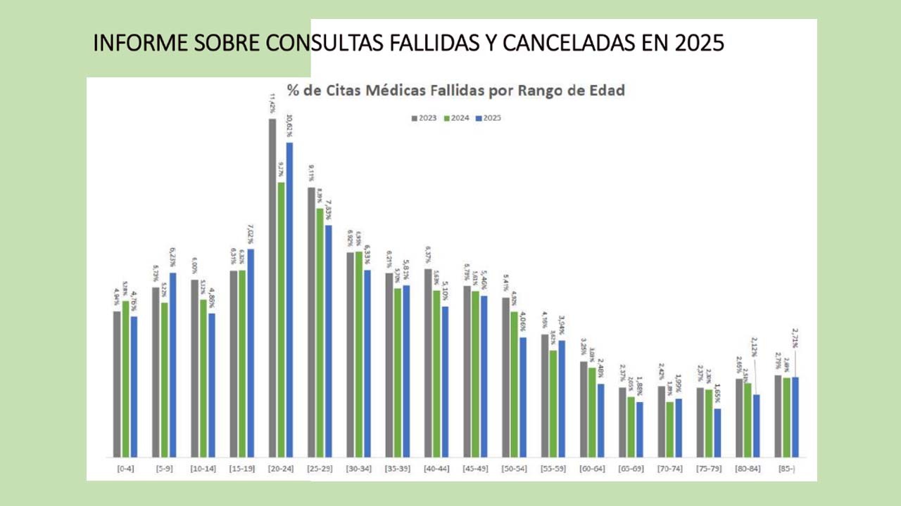 El informe también destaca una tendencia positiva: cada año disminuye el porcentaje de citas fallidas, lo que refleja una mejora progresiva en la asistencia a consultas.