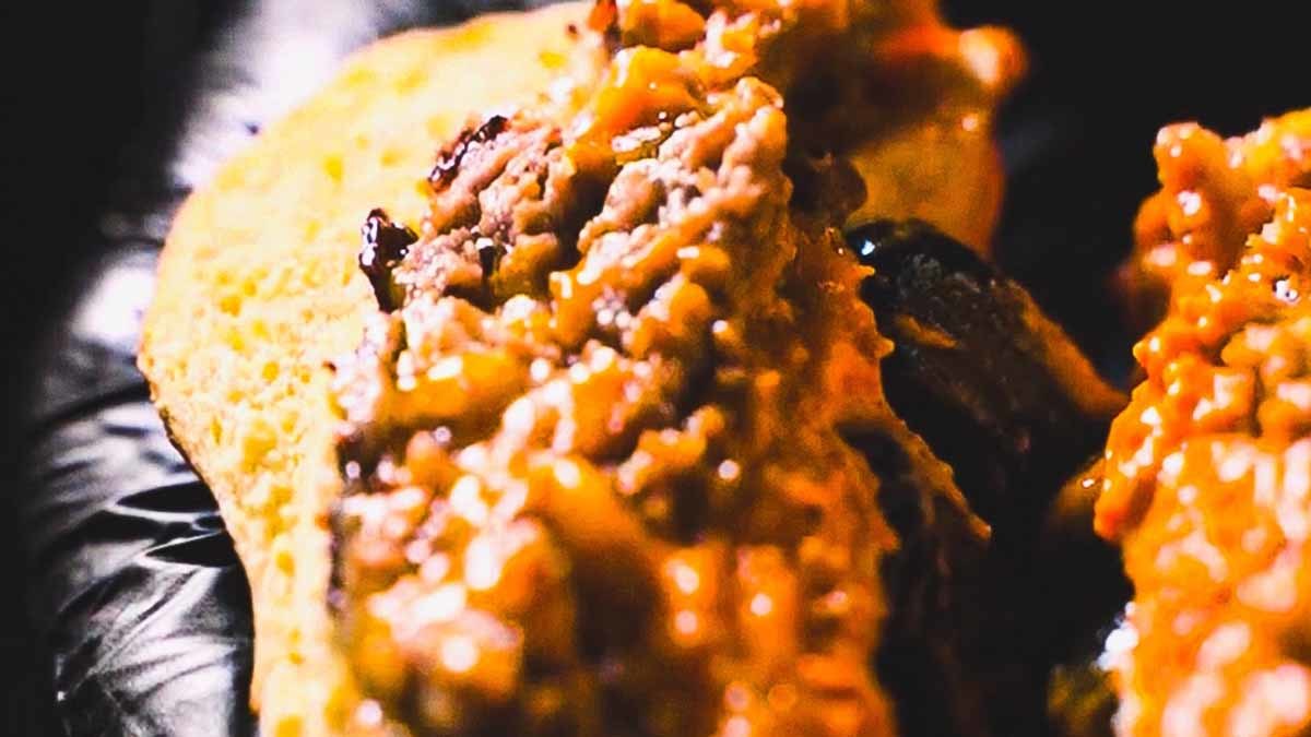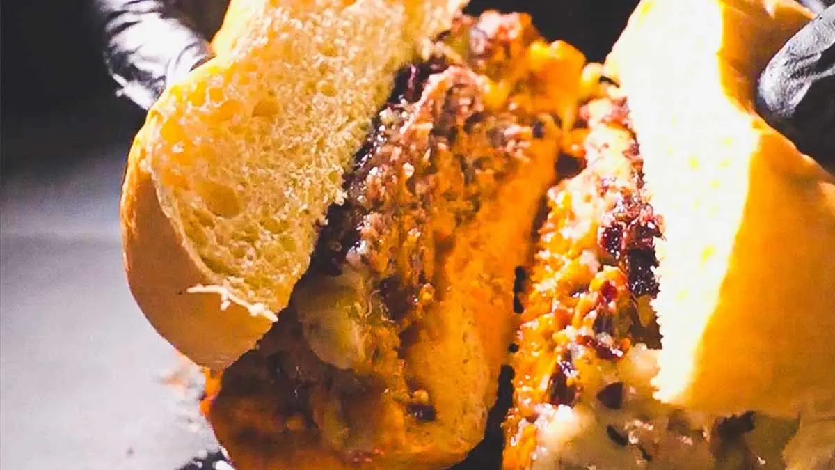 Ingredientes: Pan pretzell, salsa piquillos lodosa confitados ahumados, queso baztán tierno kamiku " legasa", blend chuletón dry aged mezcla con txistorra navarra artesana, salsa yema huevo macerada en patxarán-naranja y panceta crunchy ahumada.