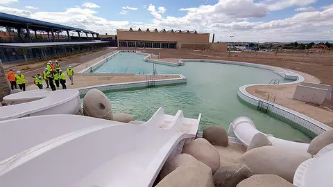 En cuanto al vaso de las piscinas, cuenta con una lámina de agua de 1.500 metros cuadrados. Con tres espacios diferenciados aunque el usuario solo aprecie una lámina única de agua. La superficie aproximada de vasos (1.500 metros cuadrados máximo), más playas, zonas de acceso, etc. ocupa en torno a los 3.000 metros cuadrados. Los elementos de zona spas se sitúan junto a una de las entradas de recreación de forma que el monitor que controla la entrada a los deslizadores o toboganes, asegura la vigilancia y control de este espacio infantil. Superficie aproximada 500 metros cuadrados.